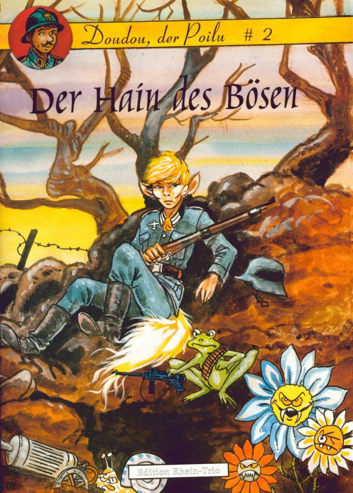 “Doudou, der Poilu” ist ein Comic, der Seinesgleichen sucht. Wo sonst begegnen Ihnen vier- und zweibeinige Pferdedeutsche, jene sanften und wunderschönen Geschöpfe, die in Frankreich und Europa einer fernen Zeit als Reittiere dienen. Nur die Wehrmachtsblusen und die Stahlhelme erinnern daran, dass diese friedlichen “Deutschen” einst kriegerische Vorfahren hatten. Die Reihe spielt in einem eigenen Universum; einer Parallel-Welt, in der Figuren und Fakten der realen Geschichte durcheinander gewürfelt sind. Doudou ist ein freier französischer Krieger und Jäger der durch ein dünn besiedeltes Europa zieht. Dort gibt es auch die »Pferdedeutschen«; faszinierende Wesen, halb Pferd halb Mensch. Kostüme und Uniformen sind dem Ersten Weltkrieg entliehen, die Serie spielt aber nicht im Ersten Weltkrieg, dies gilt es gegenüber Erstlesern zu betonen. Doudou ist in erster Linie als Fabel zu verstehen: Dabei wird nicht nur Europäische Geschichte aufgearbeitet sondern auch der Umgang des Menschen mit dem Tier thematisiert.