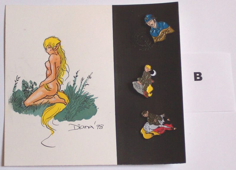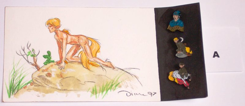 Jeder Pin ist fünffarbig emailliert und Gravur-nummeriert (1-100). Das Metall ist schwarz. Das Dreierset »Doudou, Fritz & Aslan« ist auf einer ca. DIN A6 großen, farbigen, Originalzeichnung von Diana aufgesteckt. Eine absolute Rarität!
