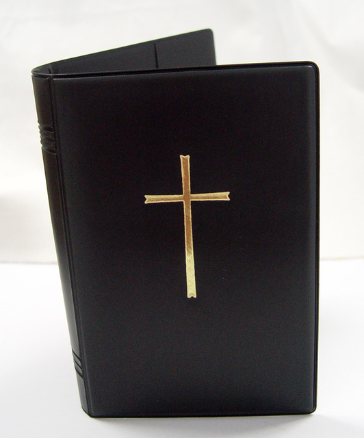Plastik-Einsteckhülle, wattiert, Farbe: schwarz, Mit Prägung: Gold-Kreuz, Material: Kunststoff, passend für das Neue Gotteslob, Maße: 18 x 12 x 4 cm.