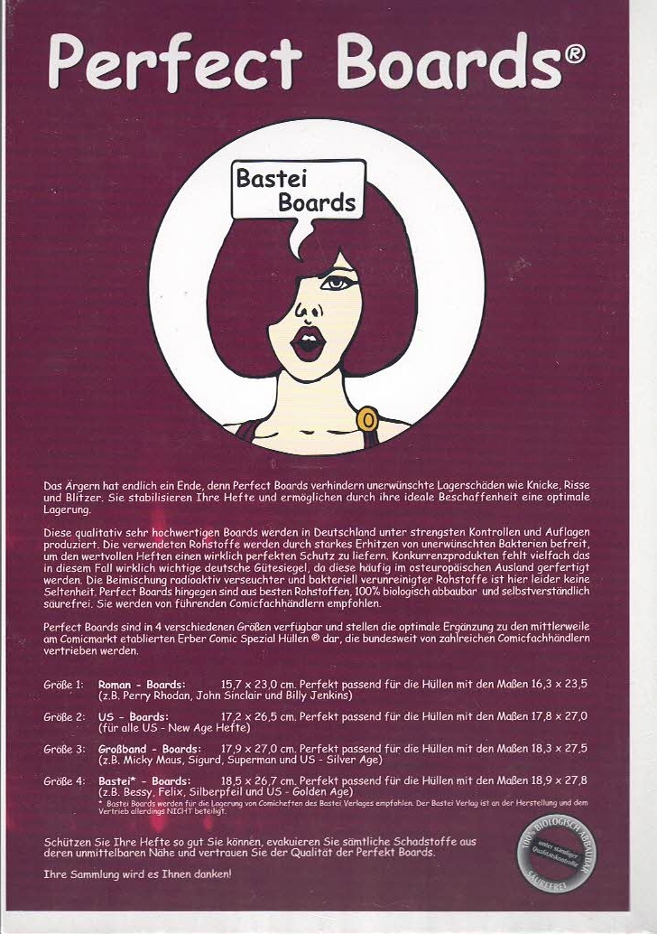 Perfect Boards (Backing Boards) sind weiße Kartonscheiben zum Verstärken der Hefte bei Hüllenaufbewahrung. Das Board wird mit der glatten Seite hinter das Heft in die Hülle gesteckt und sorgt durch seine Stabilität für zusätzlichen Schutz. Perfect Boards – Backing Boards sind absolut säurefrei, weichmacherfrei und somit archivierungssicher. Diese Backing Boards sind für Bastei-Hefte (z.B. Bessy, Silberpfeil) und Fix & Foxi-Hefte geeignet.