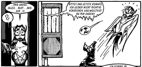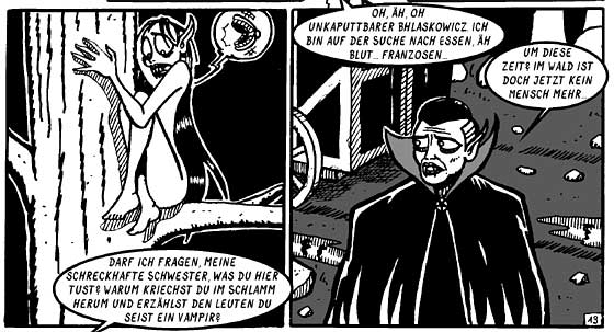 Dieses für Untote schändliche Verhalten kommt eines Tages dem Obervampir Behla Blahskovicz zu Ohren und der kommt prompt eines Tages nach Moeinia Diruata um nach dem »unrechten« zu sehen. Um Tristitia’s Loyalität zu prüfen, stellt er sie auf eine harte Probe: Sie soll ein unschuldiges Bauernmädchen aussaugen!