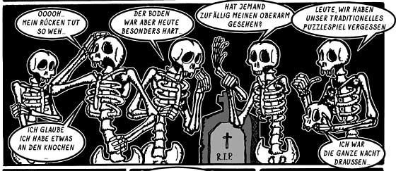 Tristitia haust mit ihren Skeletten auf der verfallenen Burg Moenia Diruta. Weil die Skelette keine Dörfer überfallen dürfen, vertreiben sie sich die Zeit mit sinnlosen Totentänzen und Knochen-Puzzlespielen.